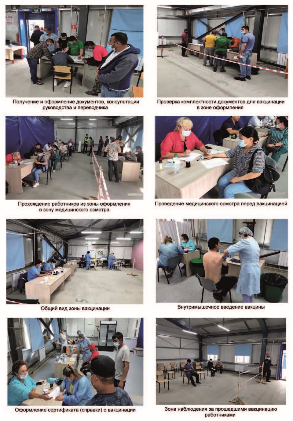 Основными особенностями вакцинации данной категории работников были их значительное количество (более 15 тыс. человек) и плохое знание ими русского языка. В связи с этим накануне дня вакцинации непосредственно в общежитиях с работниками на их родном языке проводили беседу, в ходе которой разъясняли цели вакцинации, давали информацию об используемой вакцине, правилах поведения после вакцинации, возможных побочных эффектах и порядке обращения за медицинской помощью при необходимости. После этой беседы работники под контролем медицинского персонала подрядной организации заполняли анкету и информированное добровольное согласие на проведение вакцинации, а специалисты кадровой службы делали ксерокопии паспортов и разрешений на работу в России. Формы анкеты и согласия на вакцинацию готовили на двух языках – русском и языках этнических групп работников.