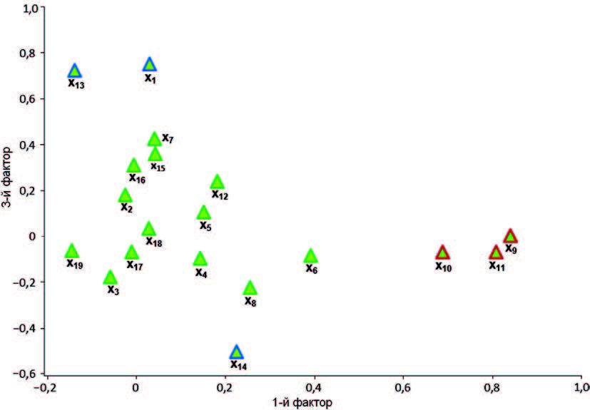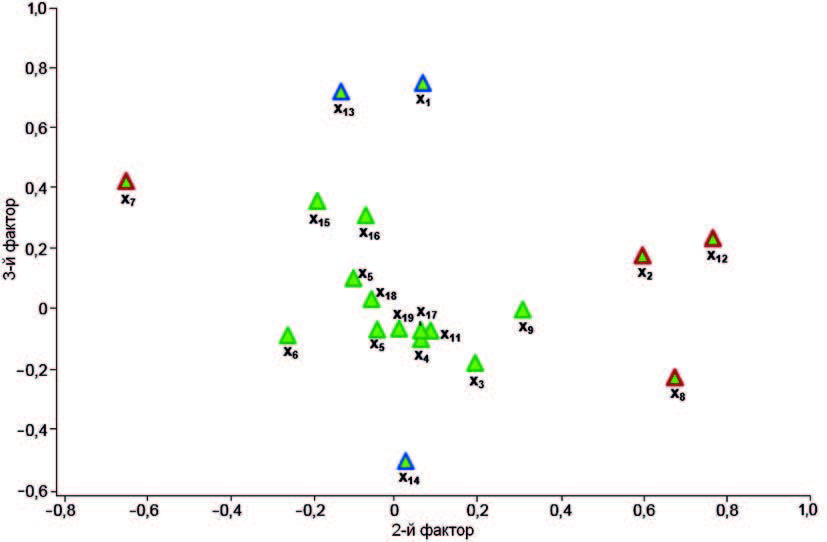 Как видно из рис. 3, можно выделить субъекты России, для которых характерны высокие значения уровня травматизма личного состава ФПС МЧС России и уровня пожарной опасности (большие значения 2-го и 3-го факторов) – это Еврейская автономная область (обозначен цифрой 1), Хабаровский край (2), Республика Бурятия (3). Для Республик Ингушетия (4), Алтай (5), Карачаево-Черкесия (6) характерен низкий уровень пожарной опасности, но высокий уровень травматизма (низкое значение 2-го фактора и высокое – 3-го фактора). Напротив, в Тульской области (7) уровень травматизма низкий, а уровень пожарной опасности – достаточно высокий (низкое значение 3-го фактора и высокое – 2-го фактора).