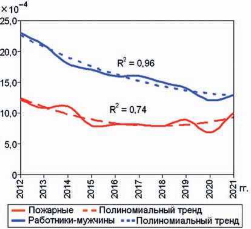 На рис. 1 показана динамика рисков производственного травматизма личного состава и работников-мужчин. При высоких коэффициентах детерминации полиномиальные тренды показывают динамику уменьшения данных. Конгруэнтность (согласованность) трендов – очень высокая, положительная и статистически значимая (r = 0,923; p < 0,001), что может указывать на влияние в развитии травматизма одинаковых (однонаправленных) факторов, таких как улучшение условий труда, совершенствование комплекса мероприятий по охране труда и средств индивидуальной защиты.