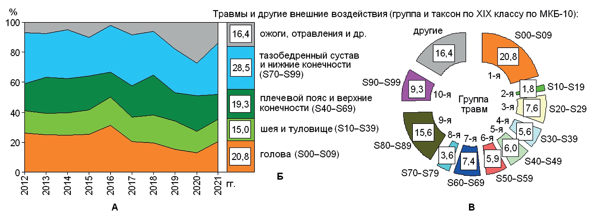 В ряде случаев в карточках указывалось: «Перелом костей верхней конечности» или, «Перелом костей нижней конечности», эти нозологии соотносили с таксонами T10 «Перелом верхней конечности на неуточненном уровне» или T12 «Перелом нижней конечности на неуточненном уровне» по МКБ-10 соответственно и т.д. При статистическом анализе указанные нозологии относили в группы травм частей тела, например, в группы 5–7-я «Травмы плечевого пояса и верхних конечностей» и 8–10-я