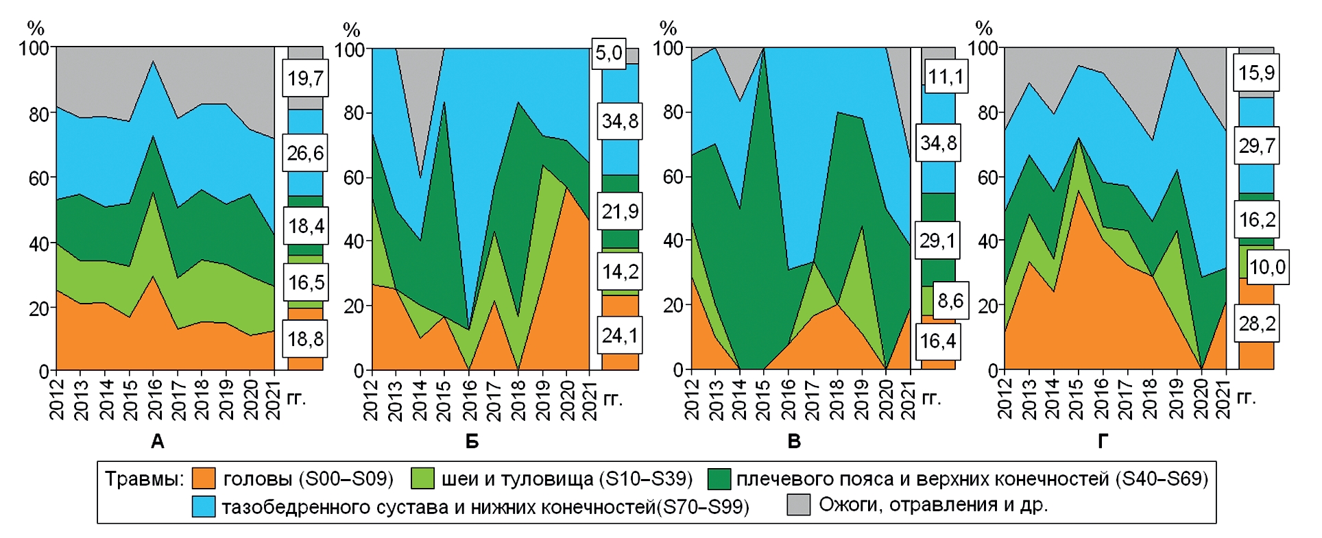 Производственные травмы соотнесли с таксонами XIX класса по МКБ-10 (табл. 3). К сожалению, клинико-морфологические особенности травм в 2012–2021 гг. были представлены не во всех изученных актах о несчастных случаях на производстве, в связи с чем эти травмы классифицировались как прочие или не идентифицированные. Некоторые малочисленные нозологии, например, T79.5 «Синдром длительного сдавления», W87 «Несчастный случай, связанный с источником электрического тока неуточненным» и другие в отдельные, анализируемые рубрики не выделяли.