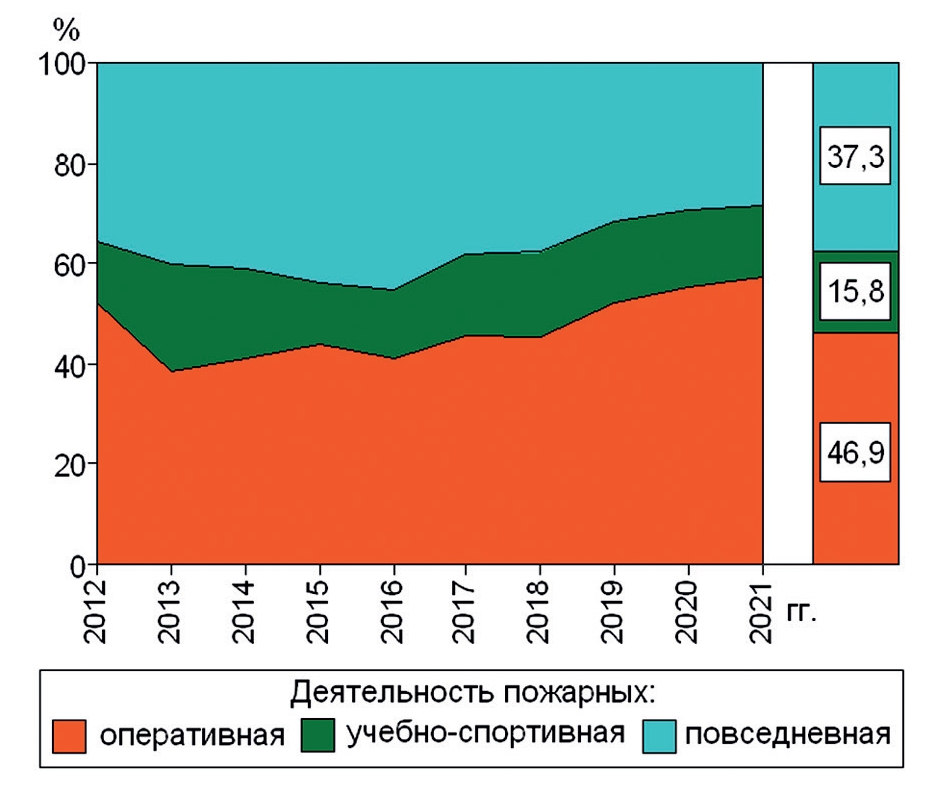 В 2012–2021 гг. при выполнении служебных обязанностей у личного состава ФПС МЧС России были зарегистрированы 1769 травм. Среднегодовой риск производственного травматизма составил (9,19±0,54) · 10⁻⁴ травм/ (человек · год), за аналогичный период у работников-мужчин России риск оказался статистически достоверно бóльшим (p < 0,001) – (16,50±1,09) · 10⁻⁴.