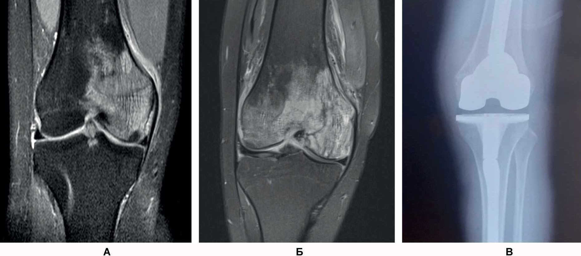 - Женщина А., 27 лет. При обращении жалобы на распирающую, пульсирующую боль в области медиального мыщелка левой бедренной кости и ночную боль (интенсивность – 7 баллов по визуально-аналоговой шкале боли, ВАШ) в левой ноге. Отмечается нарушение опороспособности на левую нижнюю конечность. Соматический и наследственный анамнез не отягощен. В мае 2021 г. перенесла острую респираторную вирусную инфекцию в легкой форме. 06.10.2021 г. выполнена спиральная компьютерная томография (СКТ) левого коленного сустава, обнаружен асептический некроз медиального мыщелка левой бедренной кости (рис. 1А). 25.11.2021 г. выполнены артроскопия левого коленного сустава, декомпрессия очага некроза. Назначено консервативное лечение. 16.01.2022 г. проведена контрольная МРТ – асептический некроз медиального мыщелка левой бедренной кости (см. рис. 1Б).