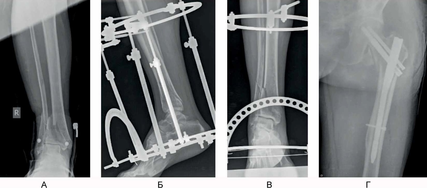 Рис. 1. Рентгенограммы пациента Б, 66 лет, в день поступления. А – первичная рентгенограмма голени и голеностопного сустава в прямой проекции; Б, В – первичная закрытая репозиция аппаратом наружной фиксации; Г – результат интрамедуллярного остеосинтеза перелома проксимального отдела бедренной кости.