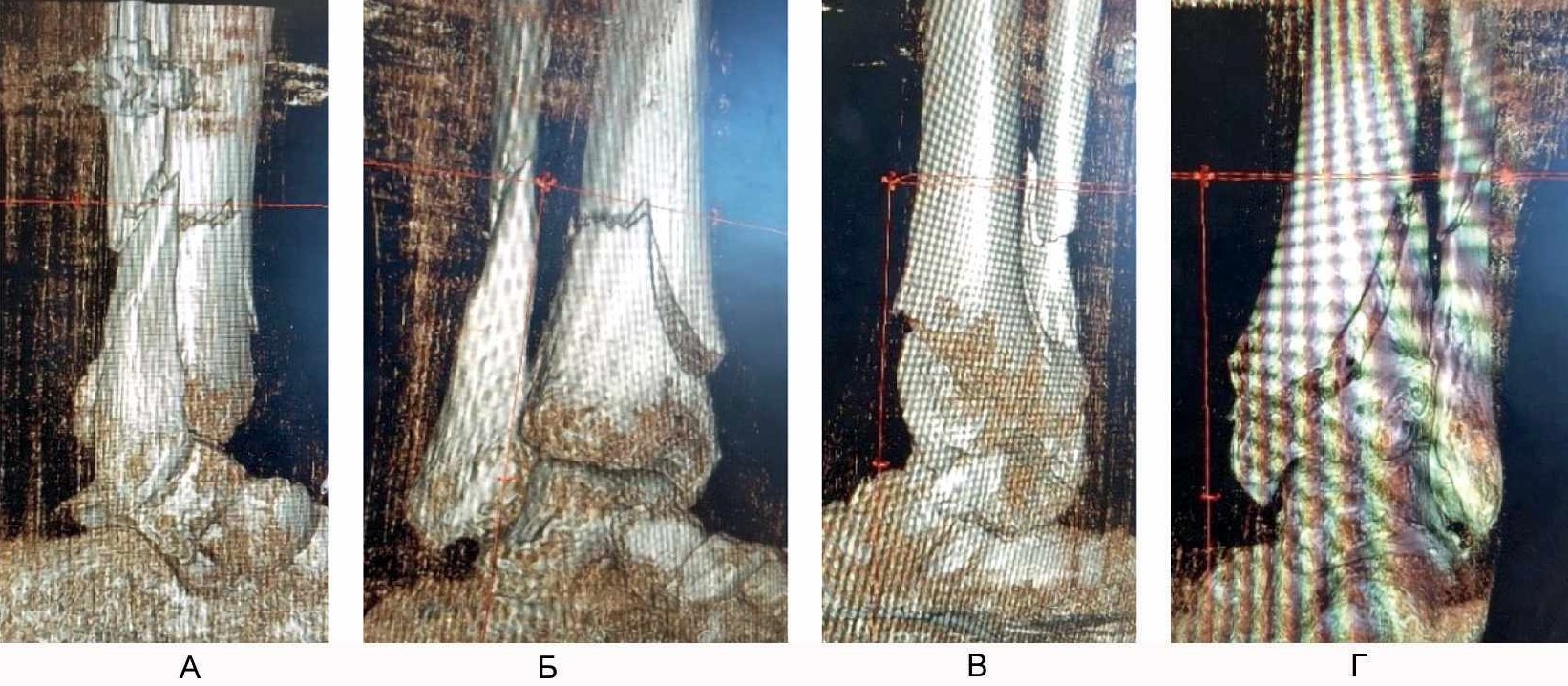 Рис. 2. 3D-реконструкция по данным компьютерной томографии для уточнения характера сложного внутрисуставного перелома нижней ⅓ костей голени. А – вид с латеральной стороны; Б – вид спереди; В – вид с медиальной стороны; Г – вид сзади.