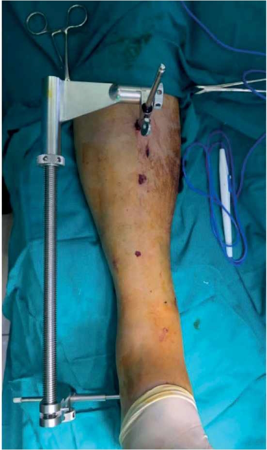 Рис. 3. Дистрактор, установленный на голень, не препятсвует выполнению остеосинтеза.