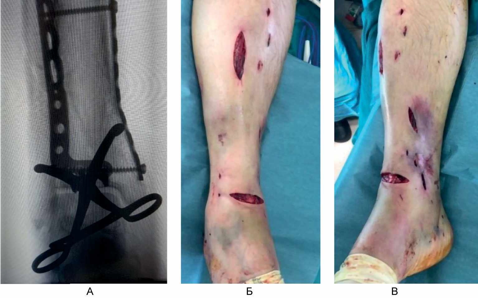 Рис. 5. Малоинвазивная имплантация металлоконструкций. А – интраоперационная рентгенограмма во время установки медиальной пластины; Б, В – интраоперационный вид конечности после установки имплантатов.