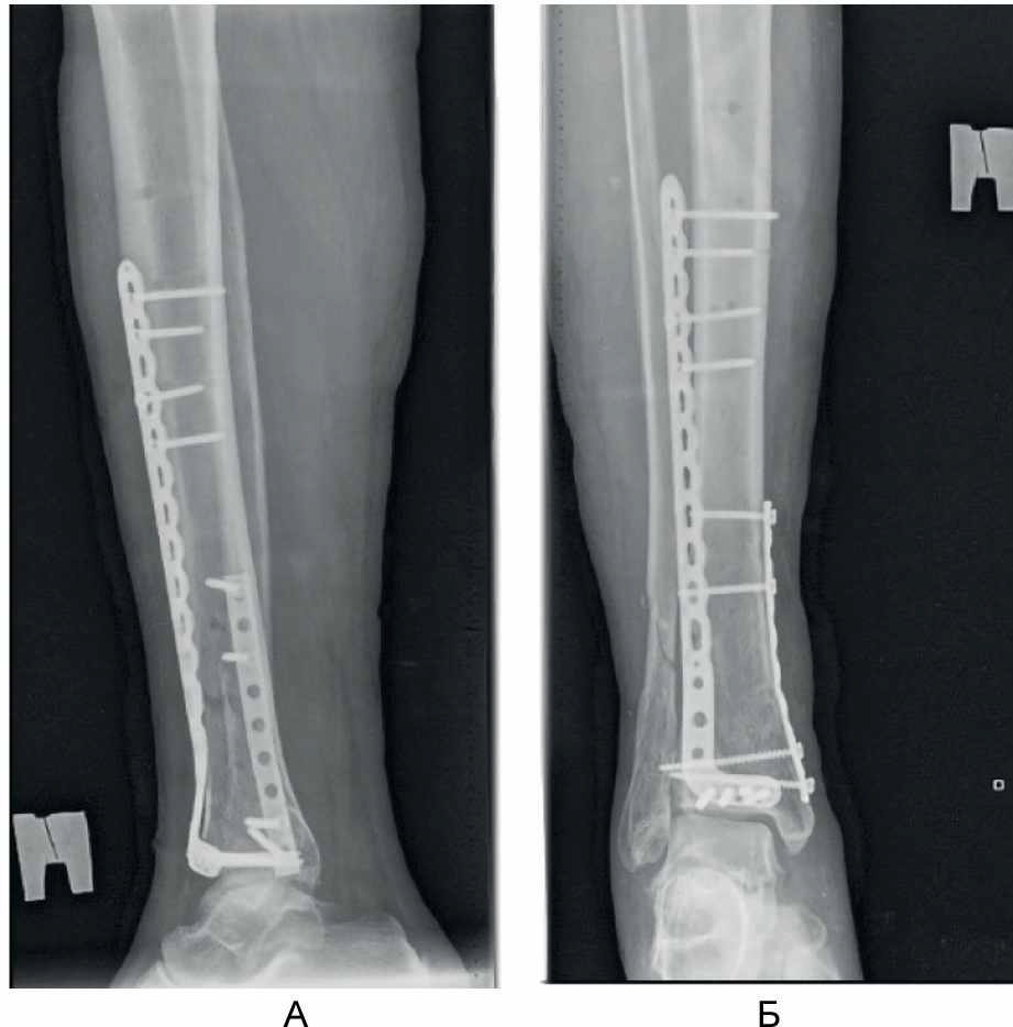 Рис. 6. Рентгенограммы в боковой (А) и прямой (Б) проекциях после выполнения малоинвазивного накостного остеосинтеза нижней 1/3 большеберцовой кости.