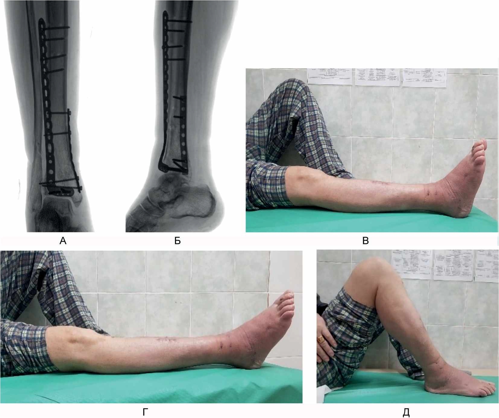 Контрольные рентгенограммы в прямой (А) и боковой (Б) проекции – определяется сращение перелома; В–Д – функциональный результат лечения.