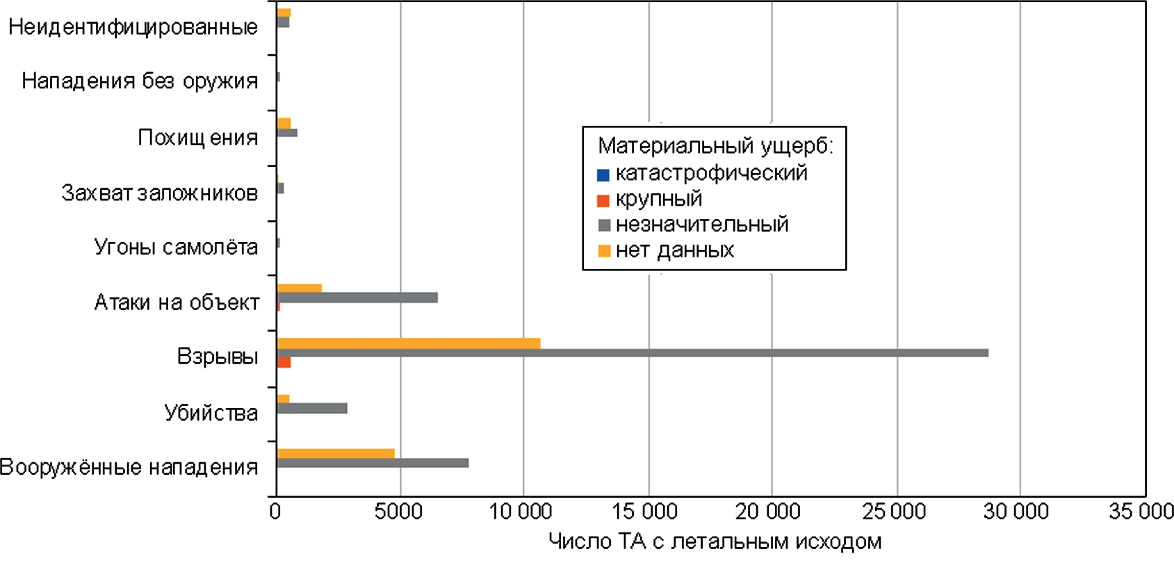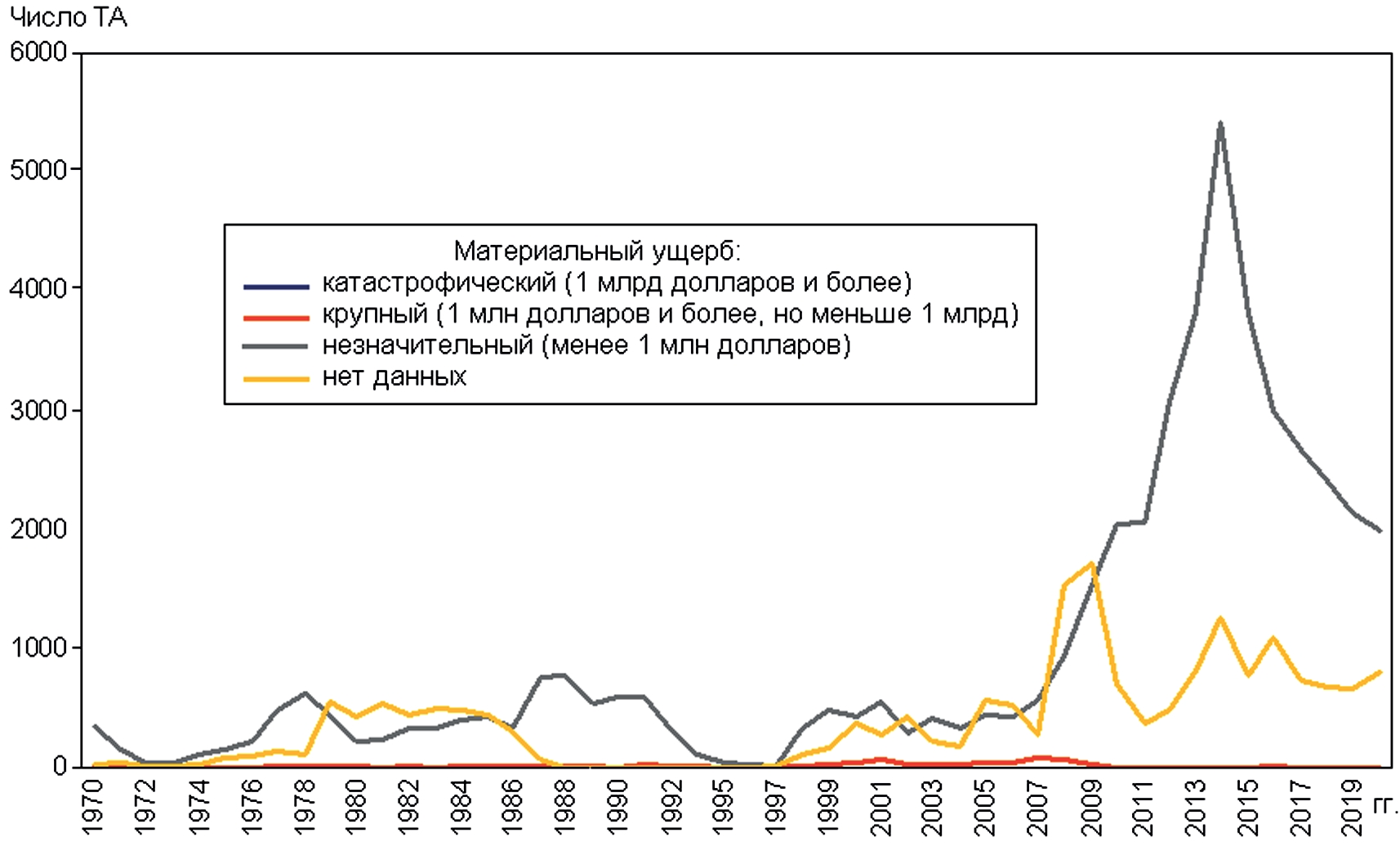 Объектом исследования явились данные о распределении ущерба и медико-санитарные последствия ТА в мире, зарегистрированные в Глобальной базе данных по терроризму (Global Terrorism Database, GTD) [https://www. start.umd.edu/gtd/]. Анализу были подвергнуты более 220 тыс. случаев террористической активности в мире в период с 1970 по 2021 г. [12]. К изучаемым данным о распределении ущерба от ТА были отнесены катастрофические последствия, выраженные в финансовом отношении как равные и превышающие 1 млрд долларов США, крупные – от 1 млн до 1 мдрд долларов США и группа незначительных с нагрузкой на бюджет по преодолению менее 1 млн долларов США. В данном случае доллар выступает как всеобщий эквивалент для Глобальной базы данных по терроризму, позволяющий измерить экономический ущерб. Исследование в области экономического ущерба в данной валюте осуществляется Институтом экономики и права (IEP, Institutefor Economicsand Peace, Сидней).