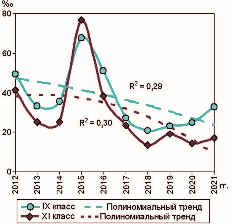 Среднемноголетний уровень общей заболеваемости (первичной и повторной обращаемости) составил 1653,09 ‰, т.е. 2 военнослужащие-женщины в течение 1 года обращались к врачу не менее 3 раз. Динамика уровня общей заболеваемости показана на рис. 1. При значимом коэффициенте детерминации (R2 = 0,82) полиномиальный тренд показывал уменьшение данных. Например, с 2012 по 2021 г. средний уровень общей заболеваемости уменьшился в 1,3 раза.
