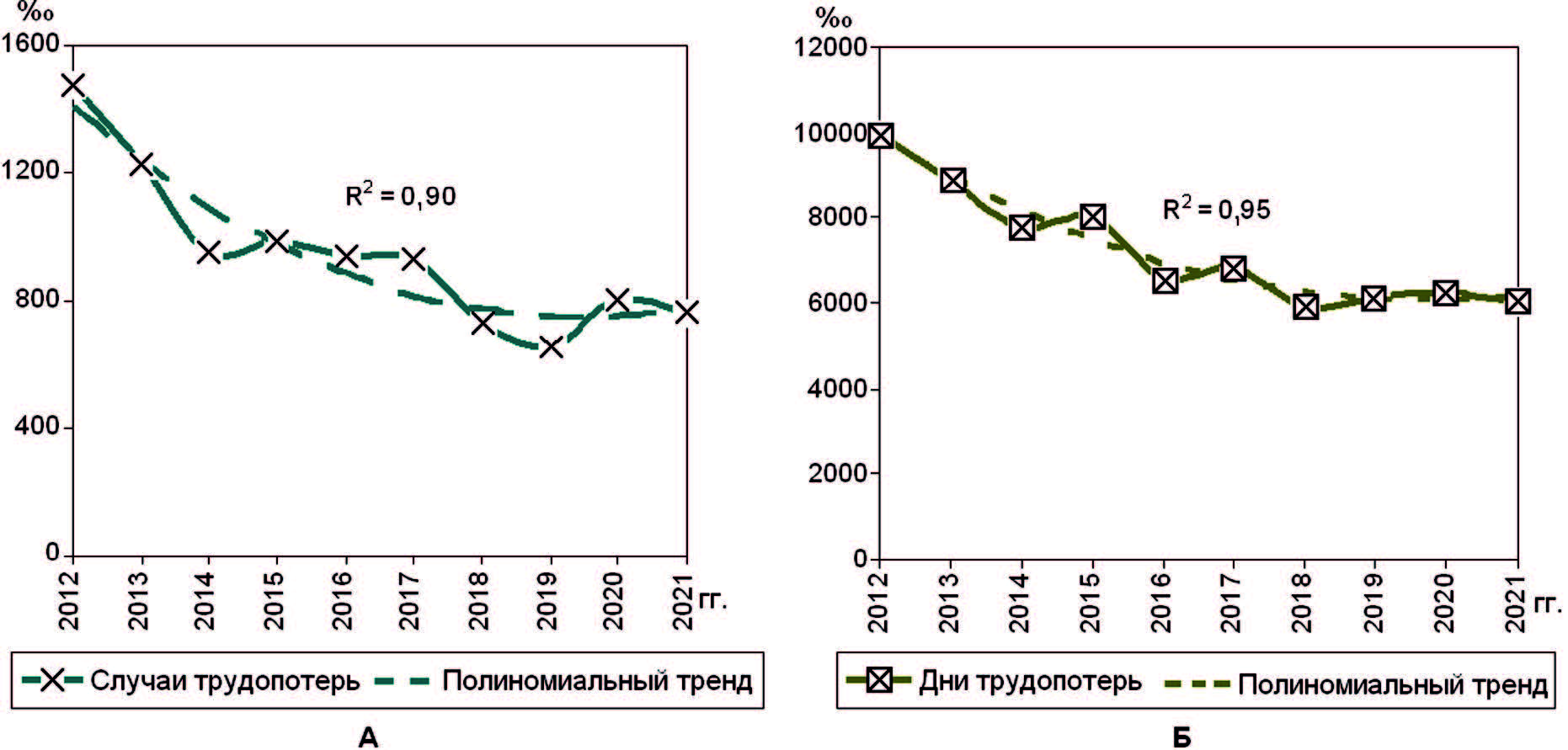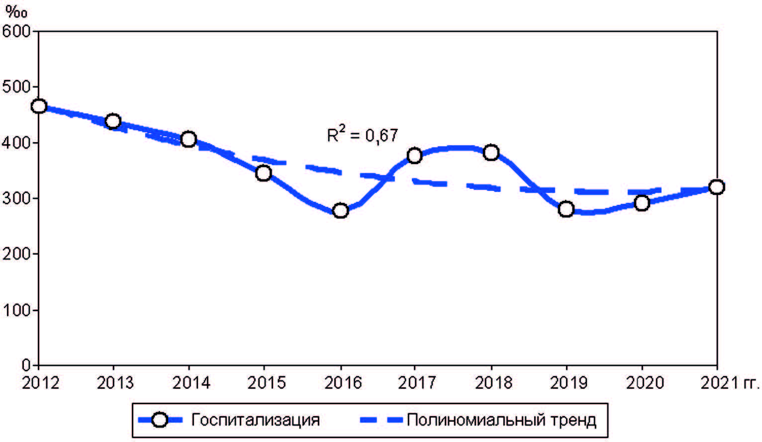 Среднемноголетний уровень всей обращаемости (общей заболеваемости), рассчитанный по абсолютным данным у военнослужащих-женщин, с 2012 по 2021 г. составил 1653,1 ‰, первичной заболеваемости – 770,6 ‰, нуждаемости в диспансерном наблюдении – 186,3 ‰, госпитализации – 347,2 ‰, случаев трудопотерь – 898,9 ‰, дней трудопотерь – 6964 ‰, увольняемости – 5,11 ‰, смертности – 59,2 ∙ 10–5. При разных по значимости коэффициентах детерминации полиномиальные тренды видов учета заболеваемости показывали тенденции уменьшения данных.