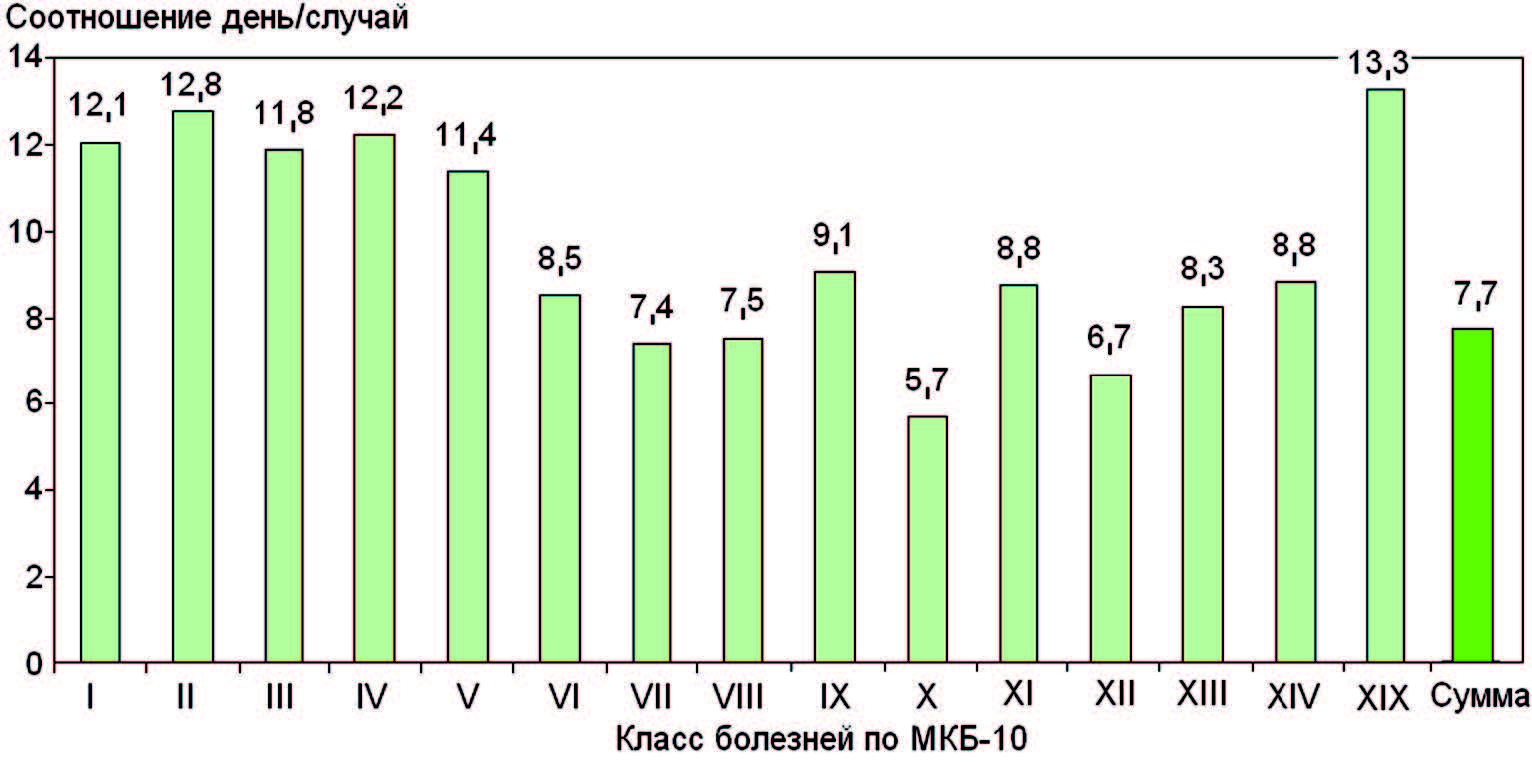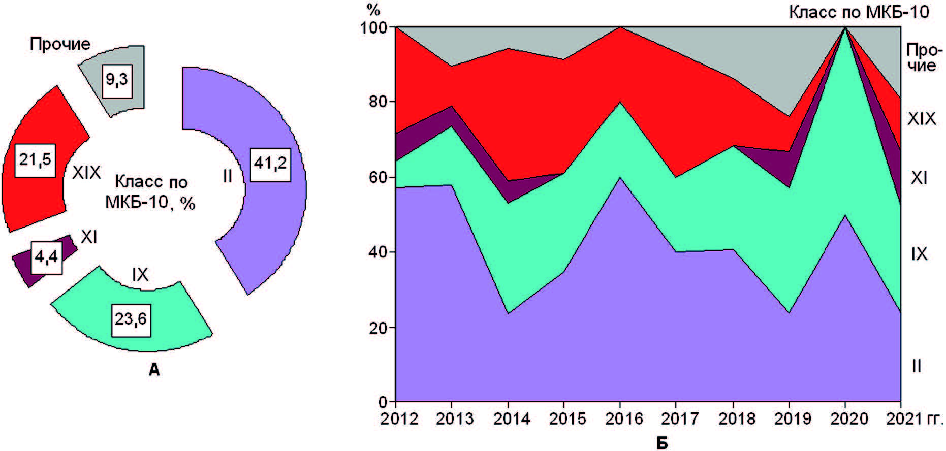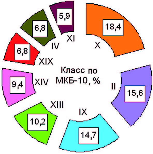 Медико-статистические показатели соотнесли с основными классами болезней и причин смерти, принятых в Международной статистической классификации болезней и проблем, связанных со здоровьем, 10-го пересмотра (МКБ-10) (табл. 1) [https://mkb-10. com/]. При анализе болезней по МКБ-10 акцент делали на ведущие классы, показатели которых имели вклад в структуру не менее 4 %.