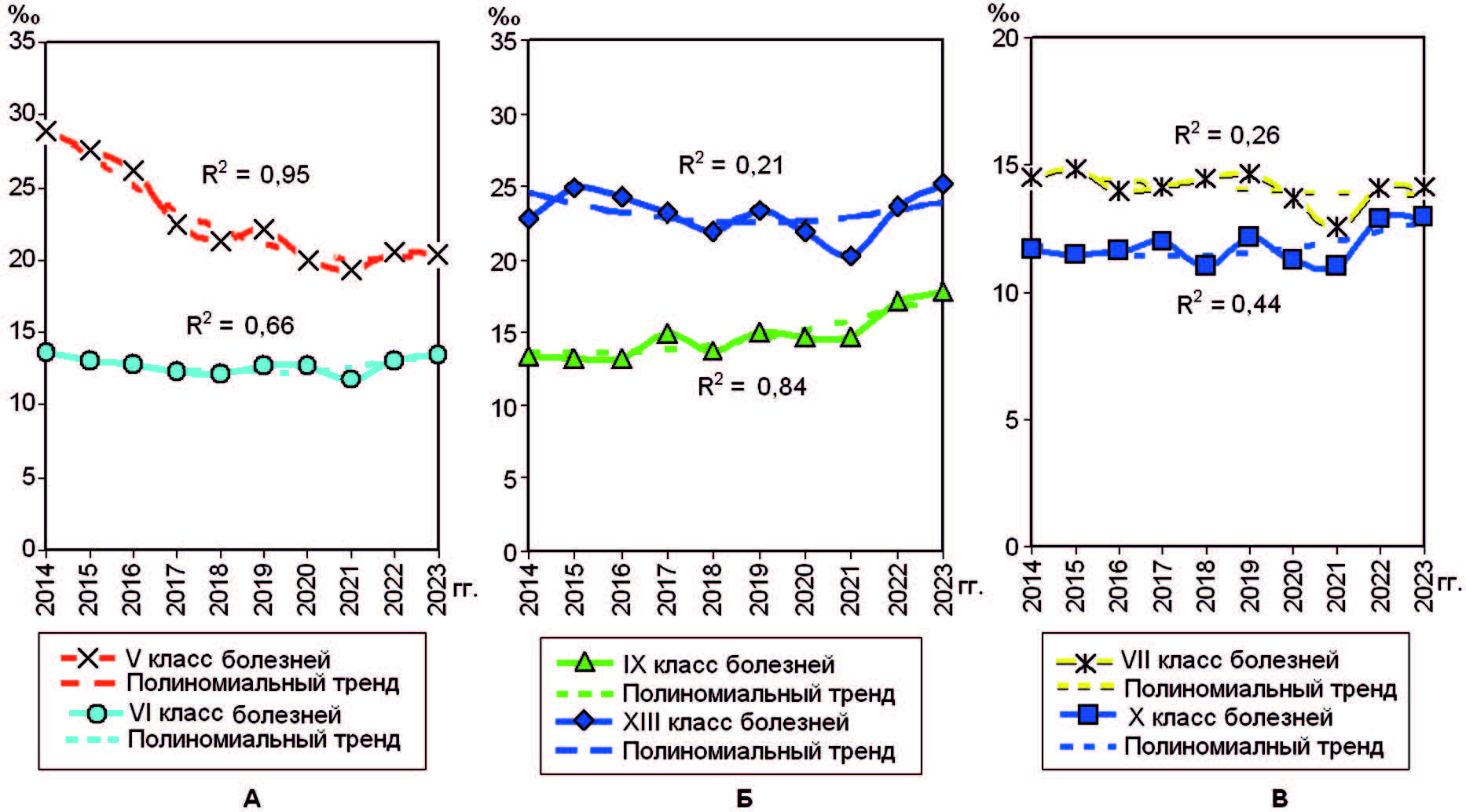 Methods. The study relied on Rosstat statistics for the Orenburg region, as well as reports and records of the Military Medical Expertise Center at the Federal Budgetary Institution “Military Commissariat of the Orenburg Region” collected over a decade’s timespan from 2014 to 2023. Conscripts were split into the following categories labelled by letters of the Russian alphabet: ‘A’ for fit for military service, ‘B’ for fit for military service with minor restrictions, ‘V’ for fit for military service with limitations, ‘G’ for temporarily unfit for military service, ‘D’ for unfit for military service. In addition, conjoined analysis of A & B categories of conscripts fit for military service vs V & D ‘unfit or fit for military service with limitations’ was performed for peacetime settings. The incidence of diseases in conscripts was correlated with relevant chapters of the International Classification of Diseases and Behavioral Disorders (ICD-10); calculations per 1000 conscripts (‰) were carried out. The obtained dynamics across different indicators was studied using dynamic series analysis and second-order polynomial trend; the determination coefficient was calculated as well.