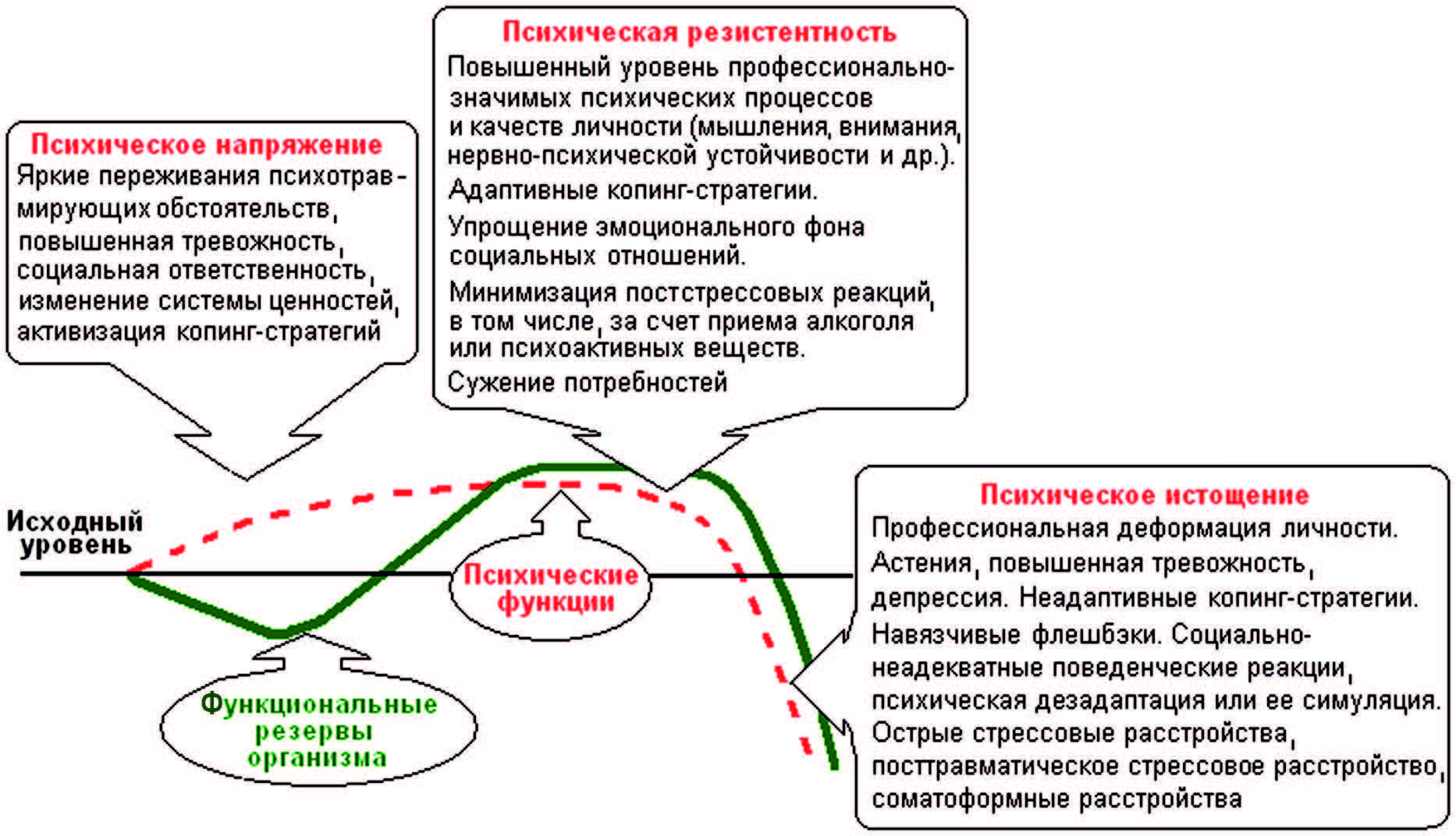 Рис. 1. Обобщенная схема изменений функциональных резервов организма и психических функций при боевом стрессе.