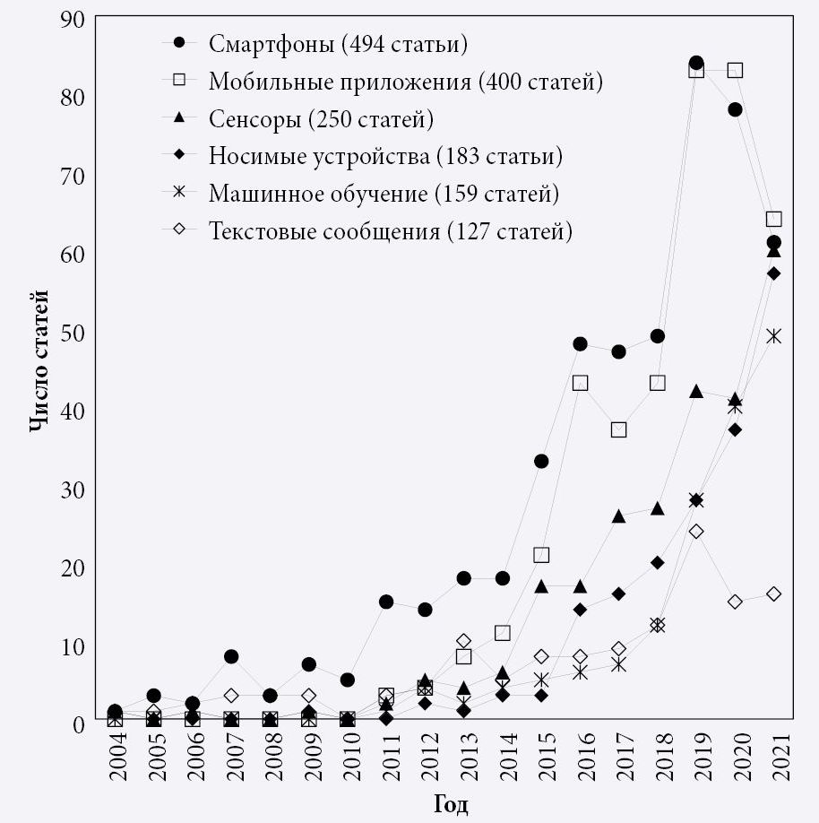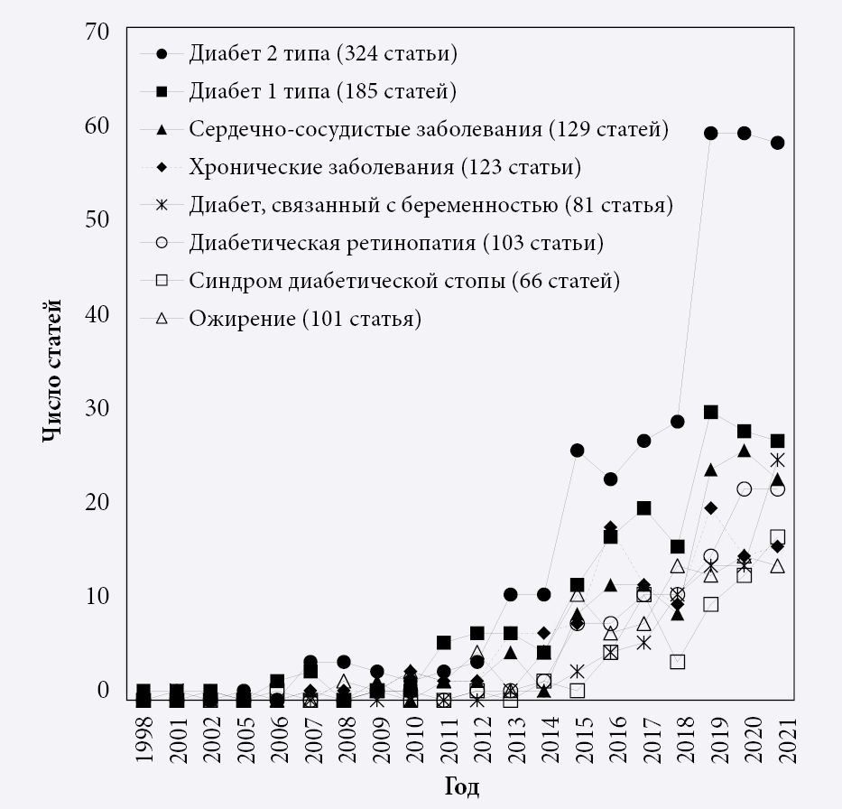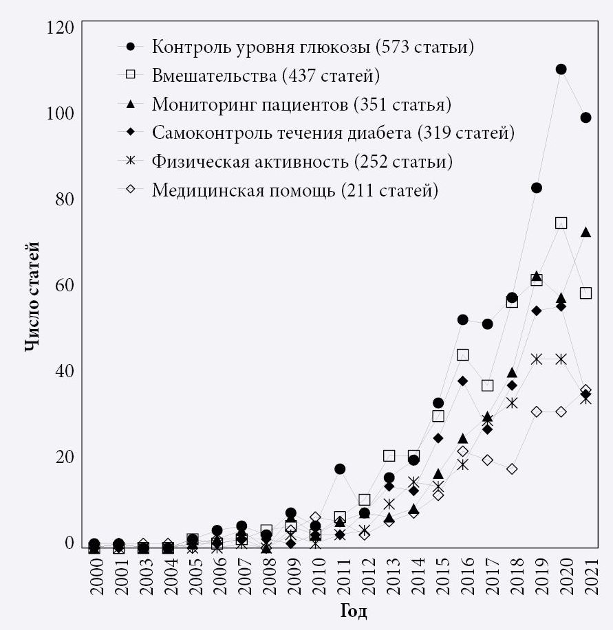 Разные виды диабета имеют свою методику лечения, но в целом корректируются путем изменений в образе жизни и самостоятельного управления терапевтическим процессом. В последние годы динамично развиваются исследования возможностей цифровых платформ, оценка их результативности, а также способы текстовой коммуникации через приложения социальных сетей и по мобильной связи. Доказана высокая экономическая эффективность ведения пациентов с диабетом 2-го типа с помощью mHealth по сравнению с традиционными методиками (Li et al., 2021). Текстовая коммуникация через мессенджеры оперативно дает подсказки по самостоятельному контролю (этой теме посвящено 185 публикаций), благодаря чему состояние организма существенно улучшается (Alanzi et al., 2018; Middleton et al., 2021). Сложились предпосылки к появлению мобильных приложений для подсчета углеводов, основанных на распознавании изображений еды с помощью искусственного интеллекта (ИИ) (Alfonsi et al., 2020). Технология флеш-мониторинга продемонстрировала эффективность регуляции уровня глюкозы и управления качеством сна пациентов (Al Hayek, Al Dawish, 2020). Разработаны автоматизированные системы типа «искусственная поджелудочная железа», функционирующие по принципу «сделай сам» и основанные на цифровых моделях с открытым кодом для определения уровня инсулина (Ahmed et al., 2020).