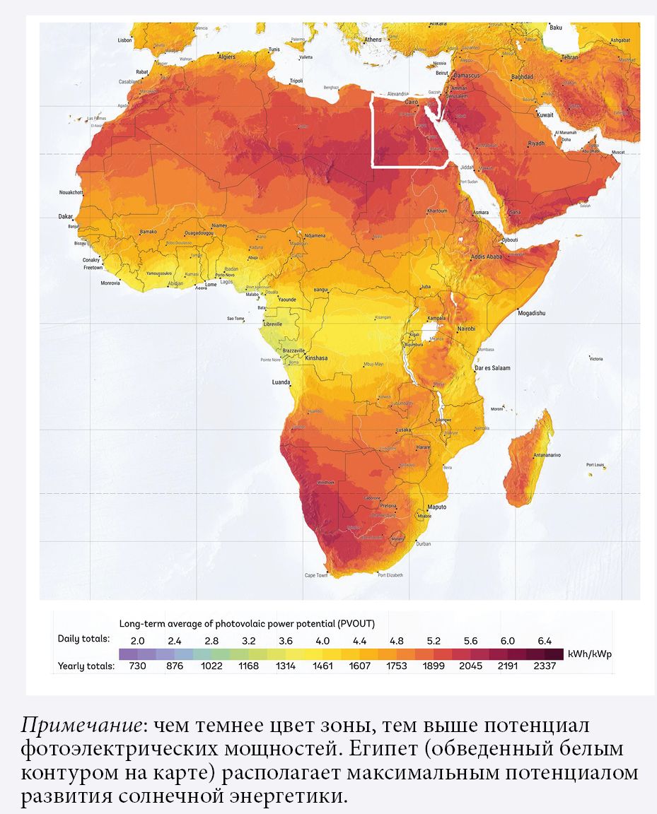 Развитие солнечной энергетики имеет большое значение для переформатирования баланса энергетической системы в Африке, которая обладает значительными «запасами» солнечной энергии — 40% мирового потенциала, при этом остро нуждается в технологиях для ее освоения (Abdelrazik et al., 2022). В настоящее время на континенте расположено лишь 1.48% суммарного мирового объема мощностей солнечной энергетики (IRENA, 2021; Huard, Fremaux, 2020). Северная Африка (географическая зона Египта), благодаря идеальному расположению в регионе Солнечного пояса, обладает обилием солнечной энергии (рис. 1).