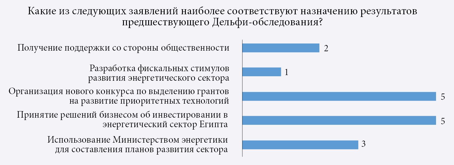 В ходе онлайн-опроса эксперты высказали степень своей удовлетворенности коммуникацией и полученными результатами. Затем мы измеряли уровень реализации сделанных предположений о тех или иных направлениях развития энергетики. Исходные утверждения относительно ожидаемого времени их осуществления, выдвинутые в 2017 г., сопоставлялись с периодом, указанным респондентами нашего оценочного обследования в 2022 г. На этой основе делались выводы о правильности либо ошибочности прогнозов «Egypt LEAPS».