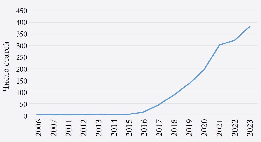 Внедрение циклических принципов в бизнес-модели предприятий критически важно для реализации экономики замкнутого цикла (Lewandowski, 2016). Под бизнес-моделью понимается метод создания, передачи и фиксации стоимости, комплексно и детально характеризующий деятельность организации (Osterwalder, Pigneur, 2010; Schneider, Spieth, 2013). Концепция БМЗЦ возникла сравнительно недавно, в 2006 г., и получила распространение примерно в 2012–2014 гг. с развитием идей циклической экономики (Schwager, Moser, 2006; Ellen MacArthur Foundation, 2012; WEF, 2014). Так, в работе (Rashid et al., 2013) отмечается роль бизнес-моделей в решении проблем, связанных с внедрением технологий вторичной переработки. В исследовании (Schulte, 2013) подчеркивается их роль в долгосрочном развитии экономики замкнутого цикла, что выражается в росте числа профильных исследований (рис. 1).