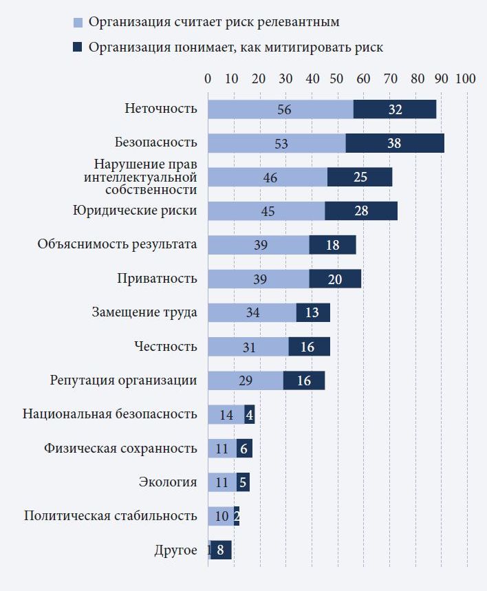 Другим сдерживающим фактором для расширения профессионального применения LLM является отсутствие эмпирического анализа эффектов от их внедрения в бизнесе, образовании и других прикладных областях (McKnight et al., 2024; Sohail et al., 2023). Как следствие, ни одна генеративная модель в настоящее время не используется как продукт профессионального труда (Noever, Ciolino, 2023). На фоне ожиданий, связываемых с их развитием, возникают очевидные риски неокупаемости, что подтверждается социологическими наблюдениями. По данным Thomson Reuters, почти 60% опрошенных юристов не уверены, что GenAI повлияет на создание добавленной стоимости юридических услуг. Не менее 70% респондентов заявили, что видят наибольшие риски использования LLM в низкой точности ответов, а 57% связывают их с этической некорректностью (Thomson Reuters, 2024). Схожую картину показывает опрос, проведенный McKinsey & Company (рис. 2) – у организаций вызывают беспокойство низкое качество и ошибочность ответов, генерируемых ИИ (56%). Подобный показатель, очевидно, не соответствует критериям профессионализма.