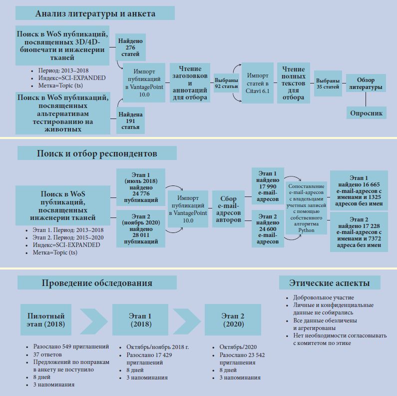 Составлению анкеты предшествовало сканирование публикаций в WoS, посвященных 3D/4D-биопечати, инжинирингу тканей и альтернативам использованию животных в научных исследованиях. Поисковые формулы представлены в боксе 1.