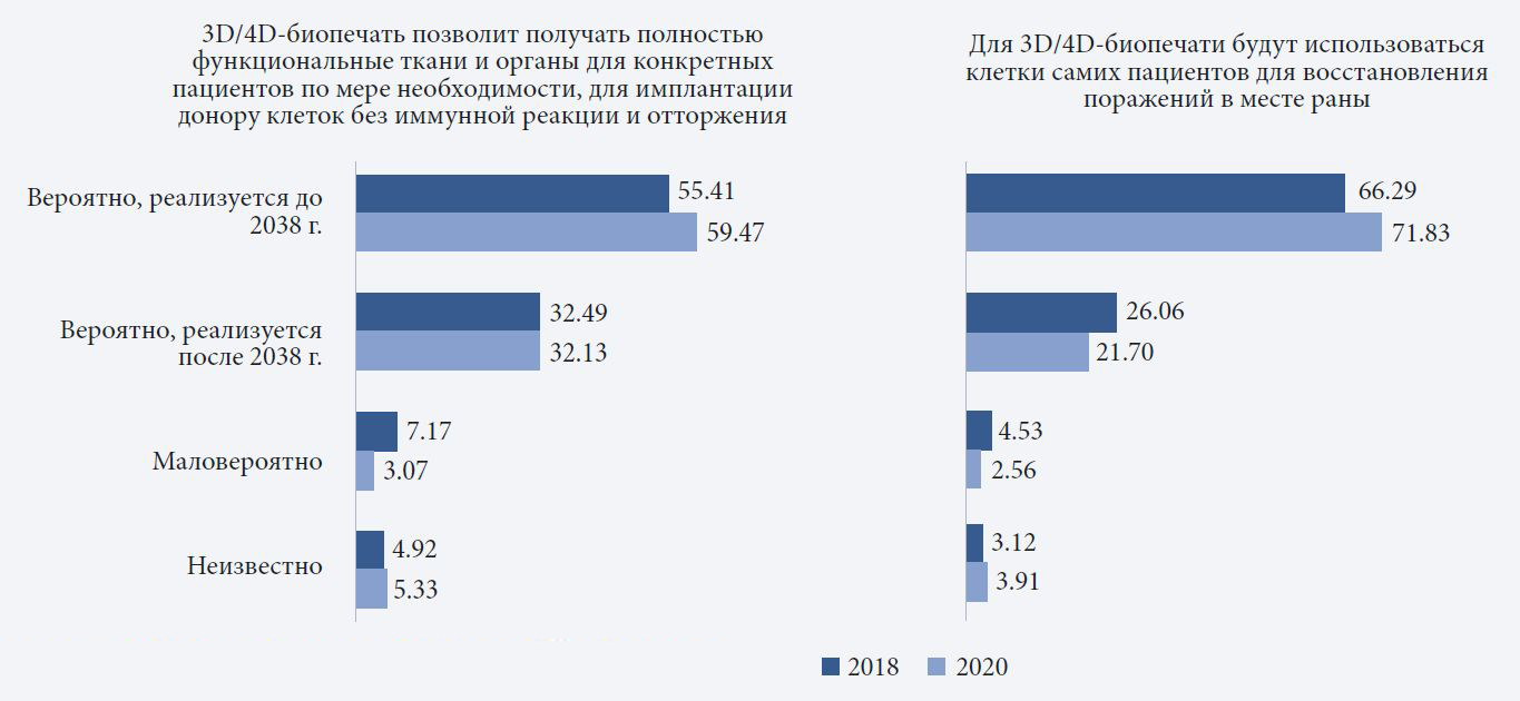 В исследовании представлены результаты двухэтапного глобального опроса ученых, специализирующихся в области инжиниринга тканей, о перспективах использования 3D/4D-биопечати в биомедицинских исследованиях, для тестирования лекарств и в медицине. Оценены изменения в ожиданиях экспертов между двумя этапами опроса (в 2018 и 2020 гг.). По большинству оцениваемых тезисов выявлен рост оптимизма: доля тех, кто ожидает появления соответствующих решений до 2038 г., увеличилась. Это связано с развитием тканевой инженерии за последние два года, что позволило респондентам получить более четкое представление о будущих перспективах. Согласно результатам обследования менее чем через два десятилетия появятся 3D/4D-биопечатные ткани и органы, пригодные для имплантации и тестирования лекарств на токсичность. Возникнет новый рынок для коммерциализации биопечатных продуктов, решится проблема дефицита органов и побочных реакций на лекарства. Иными словами, технологические изменения могут существенно повлиять не только на практику биомедицинских исследований, тестирования лекарств и медицины, но и на сферу здравоохранения в целом, что подразумевает необходимость превентивного пересмотра текущей политики.