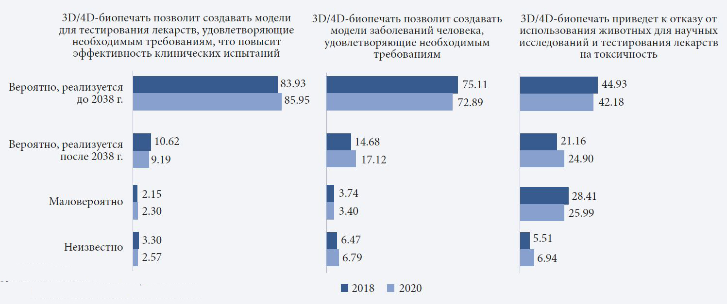 Неизвестен и потенциал 3D/4D-биопечати для прямого лечения поврежденной зоны (Huang et al., 2017). На обоих этапах допускалась его реализация до 2038 г. Принцип биопечати «на месте» (in vivo) подразумевает сканирование очага поражения и печать тканей с использованием клеток, взятых непосредственно из этой зоны (Mehrban et al., 2016; Dias et al., 2020), что может исключить последующее хирургическое вмешательство (Huang et al., 2017; Chen et al., 2020). Подобным системам предстоит пройти долгий путь, чтобы стать быстродействующими, автоматизированными и удобными для клинической практики (Dias et al., 2020). Получены положительные результаты тестирования биопечати кожи, костей и хрящей in situ на модельных животных (Albanna et al., 2019; Unagolla, Jayasuriya, 2020). Использование животных для моделирования заболевания людей и в качестве предикторов токсичности лекарств часто оказывается неэффективным, во многом из-за межвидовых различий (Rosania, 2013; Balls, 2014; Löwa et al., 2018). Предполагается, что 3D/4D-биопечать повысит результативность этого процесса, поскольку позволит создавать модели доставки лекарств к участку действия и болезней для исследований и тестирования препаратов на людях. В результате снизятся риски клинических испытаний (Burden et al., 2017a; Löwa et al., 2018; Richards et al., 2013; Lukin et al., 2019; Gardin et al., 2020; Mota et al., 2020).