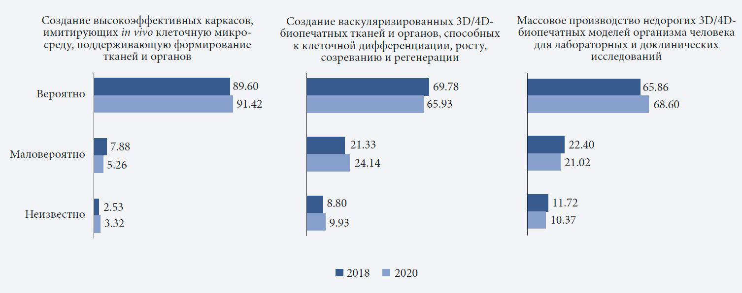 Воспроизводство 3D/4D-биопечатных моделей организма в лабораториях требует не только усовершенствованных методов, биопринтеров и биочернил, но и масштабного производства недорогих тканей (Tarassoli et al., 2018; Weinhart et al., 2019). Притом что этот вопрос получил максимальную долю ответов «неизвестно», преобладает уверенность, что к 2038 г. проблема будет решена. Ткани могут изготавливаться в необходимых количествах с небольшими затратами, если речь идет о создании органа для конкретного пациента. Проблема возникает в ситуациях, требующих создания нескольких конструкций, например, для доклинических испытаний (Daly et al., 2017). Биопечать пока еще требует существенных затрат времени и других ресурсов (Wang et al., 2020b), однако, в перспективе имеет потенциал стать базовой технологией для производства тканей и органов в больших объемах (Correia Carreira et al., 2020) и с низкими затратами (Heinrich et al., 2019).