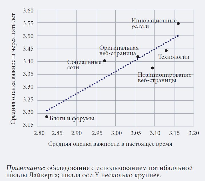 Оценивая свое отношение к инновациям ранее, малые юридические фирмы вполне сознавали, что технологический прогресс преобразует бизнес-среду, и часто сообщали о своей готовности менять способы производства и предоставления услуг (PWC, 2018). Наше обследование выявило сходную картину: респондентов просили оценить вклад технологических факторов в достижение конкурентных преимуществ и обеспечение хороших рыночных позиций в настоящее время и в перспективе. Как показано на рис. 1, респонденты полагают, что в течение следующих пяти лет вес каждого фактора будет расти, при этом самыми важными они признают создание стоимости (инновационные услуги, технологии), тогда как значение онлайн-присутствия (наличия страниц в социальных медиа, оригинального сайта, его позиционирование) было оценено ниже.