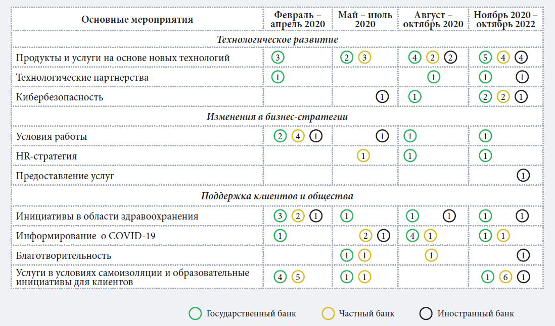 Рассматривались такие аспекты, как «Технологическое развитие», «Изменения в бизнес-стратегии банков» и «Поддержка клиентов и общества». Каждое из них включает несколько подкатегорий, отраженных в табл. 1. Сводка по реализованным мероприятиям представлена на рис. 1. Наше исследование не фокусировалось на разборе конкретных практик, а ставило задачу в целом оценить применение банками своего технологического потенциала для реагирования на пандемию. Для этого использовался кейс-анализ (Creswell, Poth, 2017; Yin, 2009). Надежность исходных данных обеспечивалась путем триангуляции (Riege, 2003). Информация аккумулировалась из разных источников (сайтов, пресс-релизов, годовых отчетов и презентаций для инвесторов). Собранные сведения сопоставлялись с данными от СМИ, не связанных с изучаемыми компаниями, и дополнительно проходили валидацию отраслевыми специалистами. Чтобы устранить фактор предвзятости отдельных экспертов, применялся метод рефлексивности (Lincoln, Guba, 1985). Это связано с тем, что в исследовательскую группу входили представители двух государств и двух организаций, специализирующиеся по разным научным направлениям и имеющие неодинаковый опыт в плане продолжительности карьеры и ее траектории. Собранная информация была тщательно закодирована, отсортирована, структурирована в базу данных и системно проанализирована (Lincoln, Guba, 1985; Golafshani, 2003; Riege, 2003).