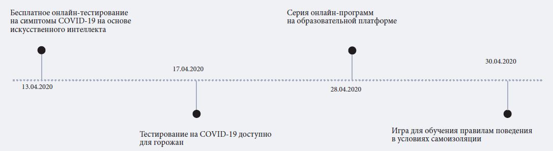 На рис. 2 показаны первые шаги банков во время карантина (февраль – апрель 2020 г.), направленные на преодоление его негативных последствий и разработку систем мониторинга состояния здоровья. Например, появилась возможность бесплатно пройти онлайн-тест на симптомы COVID-19 на основе ИИ: вначале только для клиентов, а впоследствии и для всех жителей города. Банки начали также содействовать адаптации к новым условиям российской системы образования, столкнувшейся с необходимостью быстрого внедрения дистанционных форматов в учебный процесс. Одна из частных структур инициировала на своей образовательной платформе серию онлайн-программ. В числе первых сервисов оказалась игра, обучающая правилам поведения в условиях самоизоляции. До этого группа ее разработчиков создавала инструменты для набора персонала и привлечения клиентов.