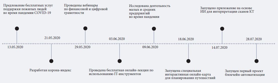 В мае – июле 2020 г. банки сфокусировались на создании систем мониторинга макроданных и блокчейн-технологий (рис. 3). Совместно с медицинским стартапом были разработаны бесплатные услуги поддержки пожилых людей во время пандемии COVID-19. Государственный банк сконцентрировался на образовательных проектах, организовав серию вебинаров по финансовой и цифровой грамотности. Частный банк организовал бесплатную онлайн-лекцию о возможности использования IT-инструментов в разных профессиях. Иностранный банк представил исследование, сравнивавшее поведение малого и среднего бизнеса до и после пандемии. Для более состоятельных клиентов разработана интерактивная онлайн-карта (с игровыми элементами) для планирования дальних поездок после снятия карантинных мер. Предложен «корона-индекс» для мониторинга развития российской экономики во время пандемии. Департамент искусственного интеллекта российского государственного банка создал приложение на основе ИИ для интерпретации компьютерных томограмм. Один из проанализированных банков (иностранный) внес существенный вклад в развитие технологии блокчейна в России, реализовав первый для страны проект блокчейн-автоматизации. Интеграция собственной платформы с аналогичными ресурсами компании-нефтетрейдера ускорила расчеты по торговле нефтью, повысив их прозрачность.