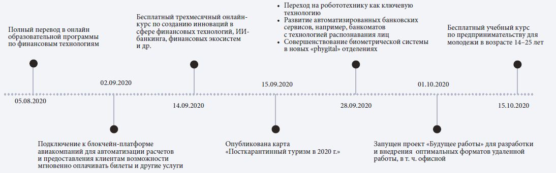 На протяжении августа–октября 2020 г. банки сосредоточили основное внимание на совершенствовании дистанционного обслуживания и учебных онлайн-сервисов для регулярного общения с самой молодой группой клиентов (рис. 4). Например, один из них полностью перевел программу обучения финансовым технологиям в онлайн и подключился к блокчейн-платформе авиакомпаний для автоматизации расчетов, предоставив клиентам возможность мгновенно оплачивать билеты и другие услуги. Затем организовал трехмесячный бесплатный онлайн-курс по инновационным финансовым технологиям, ИИ-банкингу, разработке IT-экосистем и т. д. Слушатели курса получили представление о возможностях соответствующих приложений, созданных крупными технологическими компаниями. Помимо образовательных инициатив отметим публикацию карты «Посткарантинный туризм в 2020 г.».
