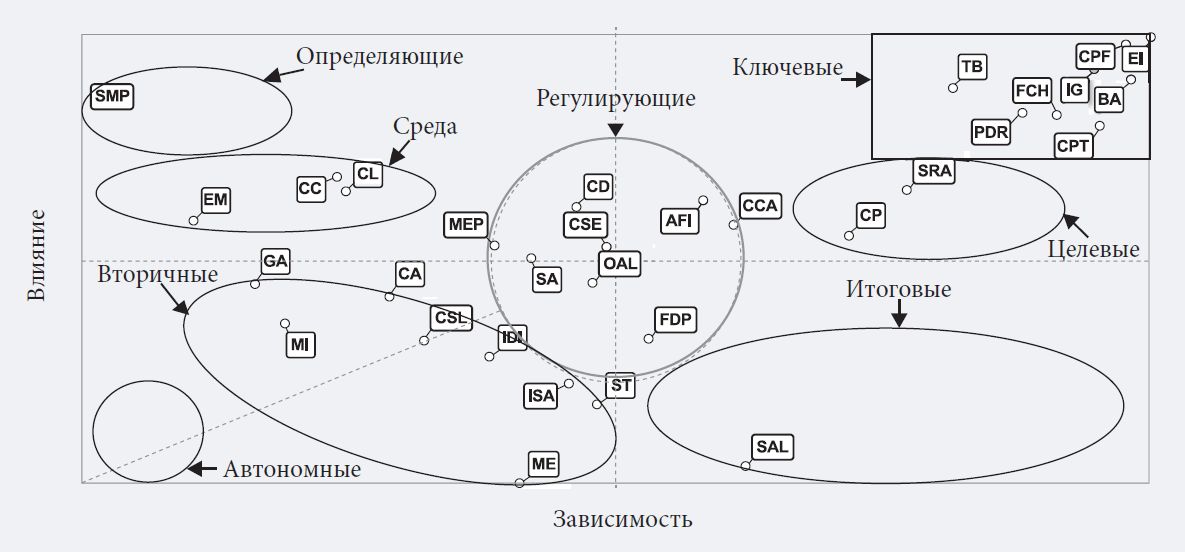 Автономные переменные | Не выявлены, что может иметь два объяснения: методологическое (все выделенные переменные существенно интегрированы в динамику системы через либо свое влияние, либо зависимость) и хронологическое (такие переменные соответствуют прошлым тенденциям или инерции системы (Godet, 1993)). Иными словами, их отсутствие является следствием короткой истории ABNSDT. |