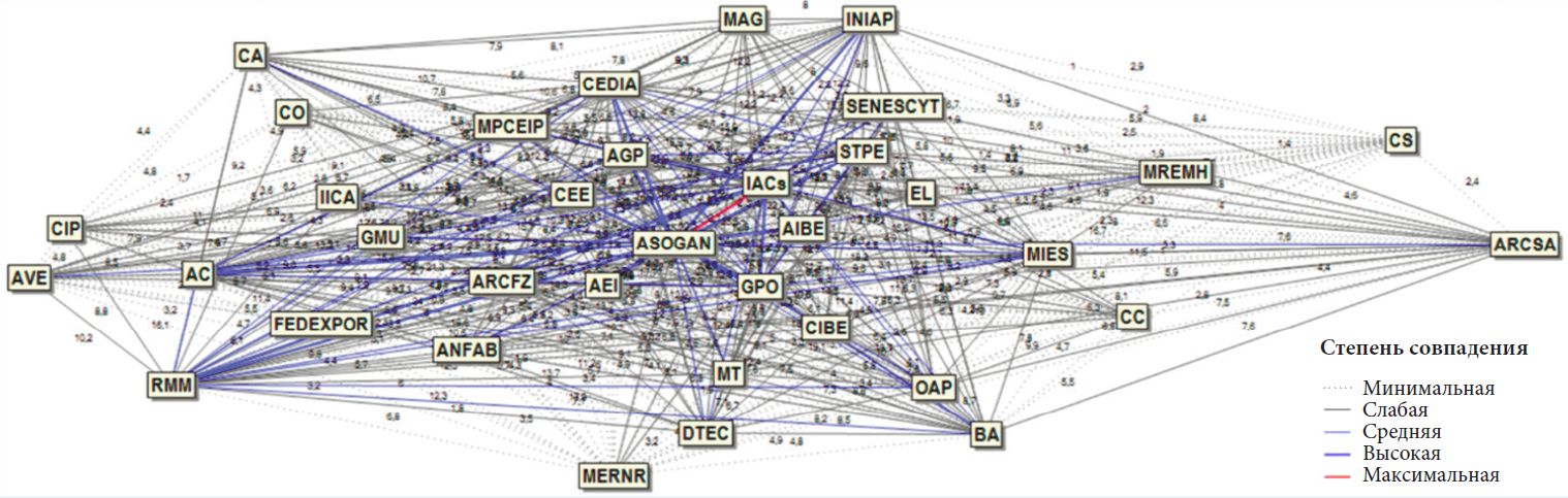 Для дальнейшего выявления совпадений и расхождений между позициями участников системы были построены графики соответствия (рис. 3) и несоответствия субъектов (рис. 4). Наибольшее соответствие было выявлено для Ассоциации скотоводов Санто-Доминго, муниципальных рыночных сетей, Министерства сельского хозяйства и животноводства, Национального секретариата высшего образования, науки, технологий и инноваций, академического сектора и Национального автономного института инвестиций в сельское хозяйство. Совпадение позиций оценивалось с точки зрения связей между местными и национальными институтами и академическим сектором, плотность которых свидетельствует о необходимости (и потенциале) выработки государственной региональной политики на основе консультаций с научным сообществом. Напротив, самые значительные расхождения наблюдаются в позициях Эквадорского комитета по делам бизнеса (CEE), Ассоциации экологической стоимости (AVE) и другими профессиональными объединениями производителей, провинциальными и муниципальными органами власти. Максимальное расхождение было выявлено между местными и региональными игроками, что подтверждает многообразие представлений о перспективах ABNSDT. В этой связи представляется целесообразным разработать инструменты территориального планирования с временным горизонтом выше краткосрочного и планировать развитие ABNSDT на основе инновационной стратегии, учитывающей положение Санто-Доминго в национальном и международном контексте.