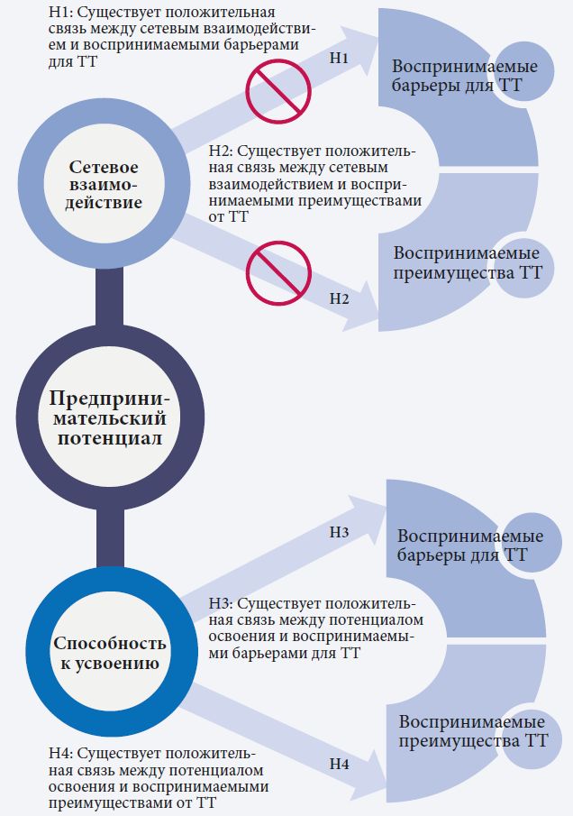 На основе полученных результатов предлагается описательная модель взаимосвязи параметров «Потенциала освоения» и «Многообразия сетевых связей», отражающая зависимость предпринимательского потенциала от барьеров и возможностей ТТ (рис. 2). Связь способности к освоению с воспринимаемыми препятствиями и преимуществами оказалась положительной, тогда как для сетевого взаимодействия она отрицательная. Иными словами, контакты с деловыми партнерами и поставщиками необязательно стимулируют активизацию ТТ.
