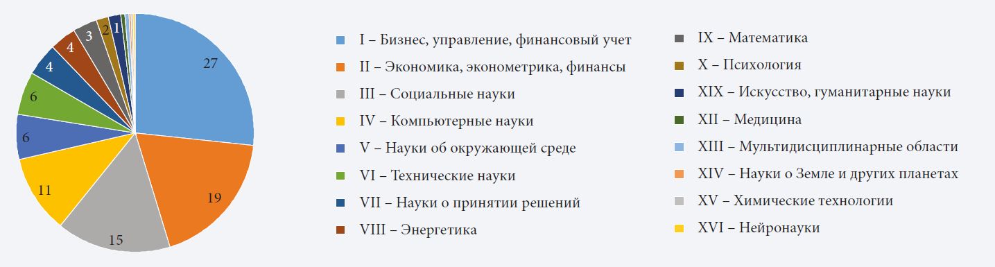 На рис. 3 представлены результаты анализа соответствующих критериям исследования публикаций в Scopus, по ключевым словам «большие данные», «ИИ», «машинное обучение», «блокчейн» и «корпоративное управление». Всего обнаружено 3453 документа, которые были разделены на 16 категорий (бизнес, менеджмент, бухгалтерский учет, экономика, финансы, социальные науки и др.).