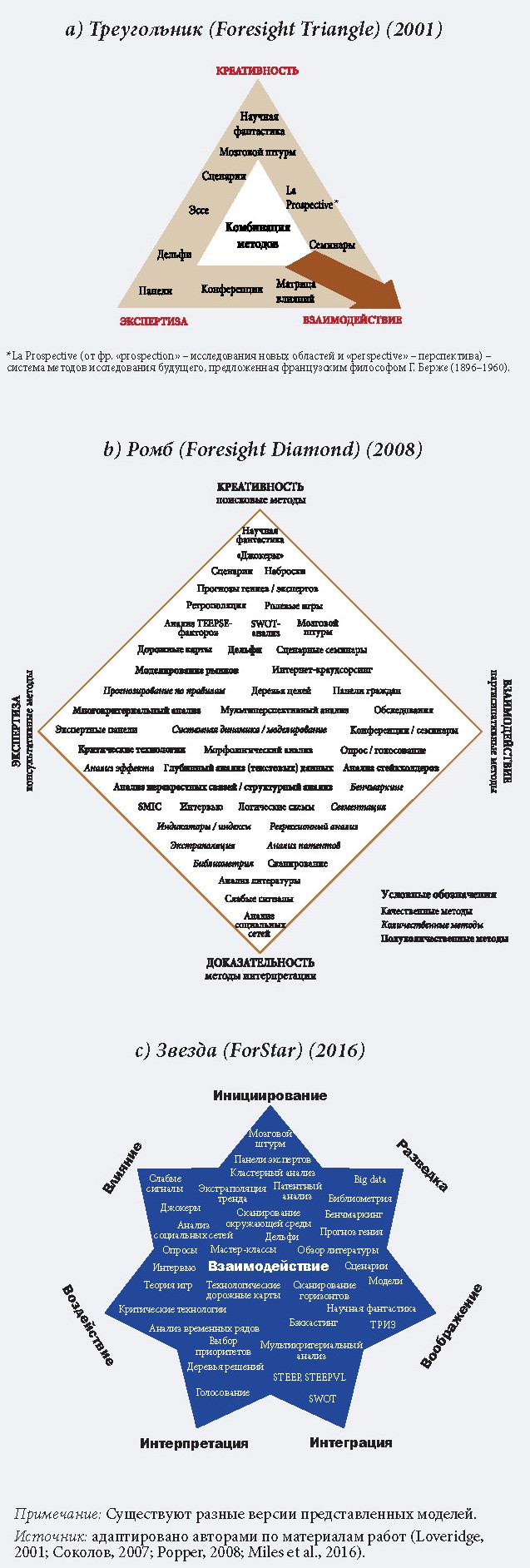 5 Заслуживает упоминания альтернативный классификационный подход из трех поколений Форсайта, предложенный Гаагским центром стратегических исследований (Hague Centre for Strategic Studies, HCSS) (De Spiegeleire et al., 2016). В рамках Форсайта 1.0 (1950–1970-е гг.) эксперты разрабатывали ограниченный набор будущих сценариев. Усовершенствованная версия — Форсайт 2.0 (1980–2010-e гг.) приобрела интерактивный характер: в процесс стали вовлекаться междисциплинарные команды. Форсайт 3.0 (термин предложен в 2016 г.) основывается на синтезе количественных и качественных инструментов.
