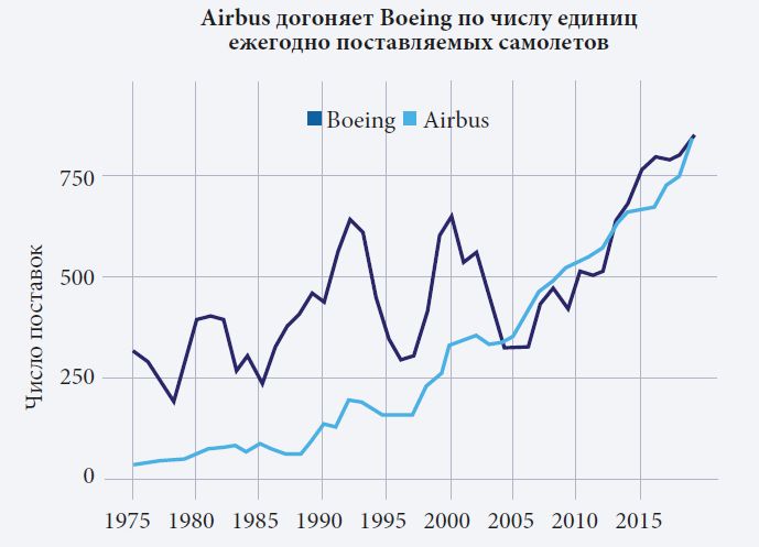 Рис. 2. Сравнительная динамика объемов производства Airbus и Boeing