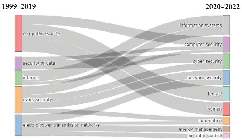 Другая задача нашего исследования заключается в анализе тенденций совместной встречаемости ключевых слов в литературе по управлению кибербезопасностью. В основном меняется употребление терминов «компьютерная безопасность», «кибербезопасность» и «электросети» по таким направлениям, как «человеческие ресурсы», «сетевая безопасность», «автоматизация», «кибербезопасность», «информационные системы». Растет актуальность направлений: «автоматизация», «информационные системы», «сетевая безопасность», «киберугрозы», «интернет вещей», «восприятие рисков», «управление безопасностью», «распределение ресурсов» и «сложные сети» (до 203 упоминаний). Можно заключить, что динамика технологического развития влияет на освещение темы кибербезопасности (Marcantoni et al., 2022; Morgan et al., 2022).