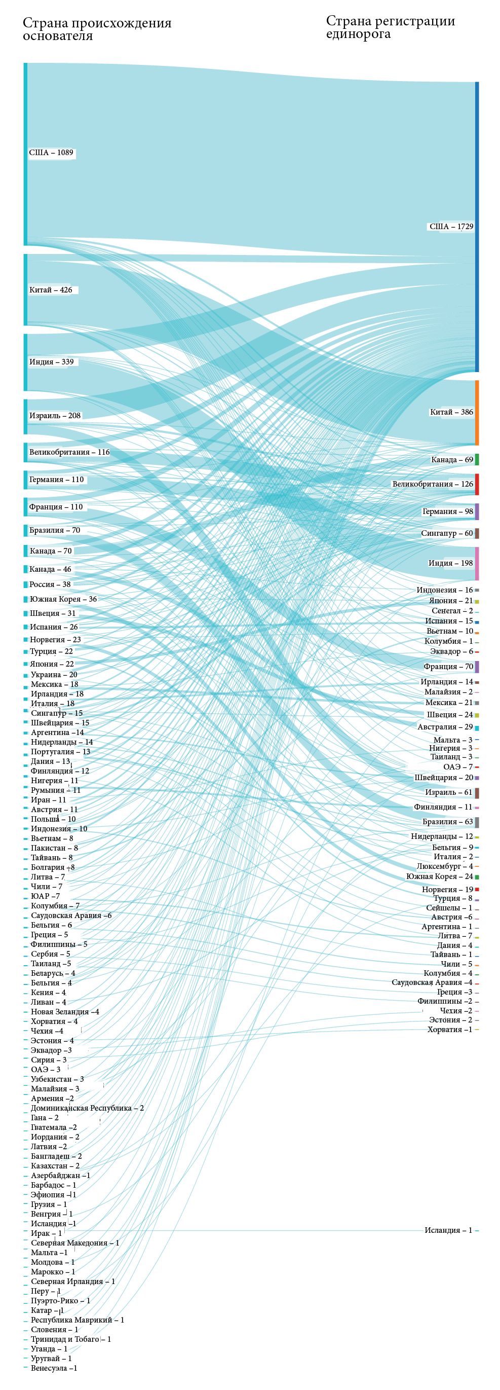Рис. 3. Глобальные миграционные потоки основателей единорогов в страновом разрезе (чел.)