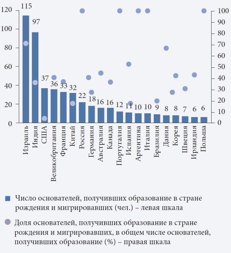 По некоторым оценкам, вклад иммигрировавших изобретателей в патентную активность выше, чем среди коренных жителей (Kerr, Kerr, 2020b). Наиболее активные новаторы с более чем 200 зарегистрированными патентами эмигрируют в пять раз чаще, чем их менее продуктивные коллеги, создавая положительные эффекты для развития инноваций в местах своей релокации (Akcigit et al., 2016; Zacchia, 2018). Одной из самых мобильных групп талантов оказываются лауреаты Нобелевской премии, треть из которых работают за пределами страны происхождения (Kerr, 2020). Примерно 70% инженеров-программистов в Кремниевой долине родились за пределами США (Kerr et al., 2016).