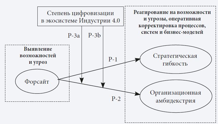 Комбинация инструментов обработки больших данных на основе машинного анализа информации, собранной с датчиков для автоматических устройств, подключенных к вычислительным системам, создает надежный фундамент для развития метакомпетенций, позволяющих реконфигурировать производство для адаптации к любым изменениям (Rosa et al., 2019; Reischauer, 2018). Однако наряду с преимуществами цифровая экосистема порождает, например, такие проблемы, как обеспечение кибербезопасности в «гиперподключенной» среде. Остается неясным, можно ли в процессе цифровой трансформации приобрести метакомпетенции, позволяющие превентивно реагировать на новые возможности и угрозы, проявлять стратегическую гибкость, дальновидность и амбидекстрию? (Jermsittiparsert et al., 2020). Возникает потребность в концептуальной структуре, позволяющей точнее оценить связь между упомянутыми способностями. В настоящем исследовании предложена подобная модель, исходящая из предположения, что степень цифровизации усиливает эффекты от взаимодействия метакомпетенций высшего уровня — Форсайта, стратегической гибкости и амбидекстрии.