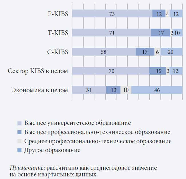 Распространено представление, что наукоемкие бизнес-услуги (knowledge intensive business services, KIBS) предоставляются высококвалифицированными профессионалами, однако их образовательный бэкграунд не уточняется, так как предполагается, что большинство из них имеют высшее образование. В результате появления новых производственных технологий растет число вакансий для работников средней квалификации с профессионально-техническим образованием (ПТО) (Autor, 2015). Особенно это касается информационных и коммуникационных технологий (ИКТ) и Индустрии 4.0 (Becker, Spöttl, 2019; Goller et al., 2021; Spöttl, Windelband, 2021), которые определят развитие сектора KIBS в ближайшие годы (Vaillant et al., 2021).