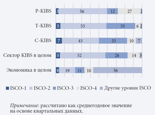 Большинство региональных стратегий, ориентированных на развитие «умного» производства, предполагают стимулирование сектора KIBS (De Propris, Bailey, 2020), потенциал которого, впрочем, не ограничивается обрабатывающей промышленностью. Компании этой индустрии могут привносить инновации (связанные прежде всего с ИКТ) и в сферу услуг, в том числе для внутреннего пользования, т. е. развития новых KIBS (Cabigiosu, 2019; Kamp, Sisti, 2018). Изучение профессиональной структуры рассматриваемой сферы позволяет выявить характерные для нее тенденции занятости (Miles et al., 2019) и востребованные компетенции (Consoli, Elche, 2013). Переосмысление функциональных ролей, профессий и навыков повысит эффективность использования новых технологических возможностей (Cabigiosu, 2019). Эти роли в значительной степени будут определяться характером выполняемой работы и вряд ли окажутся гомогенными.