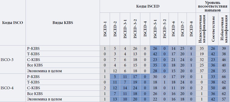 В сегменте услуг ИиР (NACE 72) лишь 28% обладателей ПТО имеют надлежащую квалификацию (химия), но существует смежная область знаний (здравоохранение), по которой профилируется значительный процент молодых специалистов. Здравоохранение как профессиональная группа подразделяется на две базовые области: персональный уход и помощь, а также техническая и лабораторная работа. Последняя тесно связана с научными исследованиями. Основные профессии носят технический характер (группы ISCO 31 и 33), включая профессионалов ИКТ (ISCO-35) и офисные кадры (ISCO-43). Наконец, доля занятых в С-KIBS, образование которых сбалансировано с должностными характеристиками, значительно ниже (21%). Для вида деятельности NACE 73 этот показатель составляет 29%, а для NACE 74 — всего 18%. Квалификационный профиль занятых в С-KIBS охватывает широкий круг дисциплин. Некоторые вакансии в компаниях с видом деятельности NACE 74, занимаемые лицами с ПТО, например ISCO-92 (уборщики) или ISCO-59 (охрана), далеки от основных видов С-KIBS.