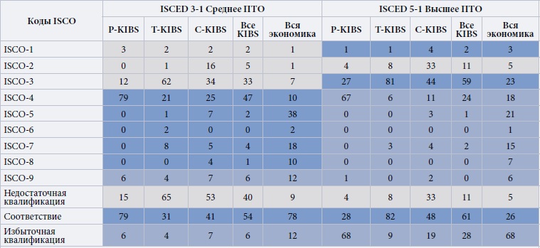 Принято считать, что KIBS предоставляются преимущественно высококвалифицированными профессионалами с университетским образованием. Однако, как показано в настоящей статье, роль выпускников ПТО в этом секторе остается недооцененной. Несмотря на значительное количество персонала с ПТО, оно, тем не менее, недостаточно из-за компетентностных нестыковок. Вертикальное несоответствие обнаружено в двух профессиональных категориях, предполагающих наличие ПТО: техники (ISCO-3) и офисные служащие (ISCO-4). Нестыковка может касаться всего испанского рынка труда, но для рассматриваемой сферы особенно заметна в Р-KIBS и T-KIBS. Избыточность квалификации означает, что часть владельцев университетских дипломов работают на позициях, которые целесообразно отдать обладателям ПТО. Нередки случаи, когда лица с высшим образованием занимаются офисной работой, скорее уместной для носителей среднего образования. При этом, если последние занимают технические должности, избыточная квалификация в одних аспектах может сочетаться с недостаточной в других. Ситуация различается по сегментам: компании Р-KIBS нанимают офисных работников, тогда как поставщики T-KIBS и С-KIBS привлекают в первую очередь техников. Это согласуется с результатами других исследований, в которых подчеркивается гетерогенность сектора KIBS (Consoli, Elche, 2010, 2013; Pina, Tether, 2016). В отношении горизонтального дисбаланса в P-KIBS и T-KIBS отметим, что компетенции в целом согласуются с профессиональными обязанностями, особенно если сотрудник обладает еще и смежными, универсальными навыками. Высокий уровень горизонтальной стыковки наблюдается в компьютерном программировании, консультировании и смежных областях (NACE 62), юридической и бухгалтерской деятельности (NACE 69). Обратная ситуация характерна для C-KIBS. Диапазон профессий, по которым работают носители ПТО, шире, а в некоторых случаях их образование и профессиональные обязанности не связаны между собой. Дальнейшие исследования позволят уточнить области знаний, в полной мере отвечающие всем видам KIBS.