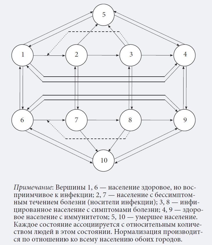 12, 67 | Население здоровое, но восприимчивое к инфекции (состояния 1, 6) с течением времени может перейти в состояния 2, 7 (население с бессимптомным течением болезни). Значения интенсивностей переходов зависят от вероятностей нахождения процесса в состояниях 3, 8. Эта зависимость на рис. 1 отражена штрихпунктирными стрелками |
