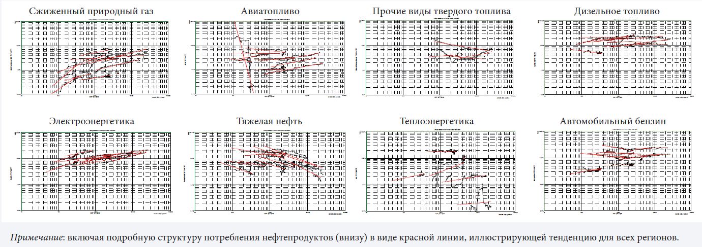 Что касается переходов внутри энергетического сектора в плане ставок на различные виды топлива, то в общей сложной картине выделяются несколько тенденций. Прежде всего отметим отказ от «грязных» (с обильными выбросами) первичных видов топлива (уголь и сырая нефть) в пользу ориентированных на потребителя и более чистых видов (электричество, тепло, СПГ и авиационное топливо). Одновременно уменьшается экономический вклад «тяжелых» отраслей (например, сталелитейной) промышленности и сельского хозяйства при увеличении доли услуг.