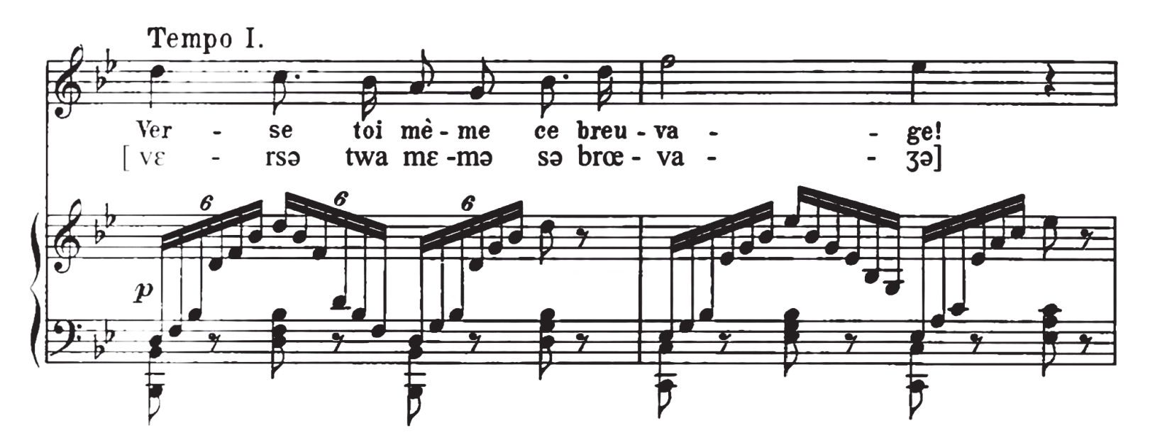 Оценка результатов первичной диагностики чаще всего демонстрирует соответствие вокальной подготовки студентов требованиям, предъявляемым к обучающимся на данном курсе [1, 2]. Однако первоначальные знания у студентов о фонетическом строе и артикуляционной базе французского языка и о правилах чтения либо минимальны, либо отсутствуют. Как правило, большая часть студентов не владеет навыком составления транскрипции текста с использованием символов Международного фонетического алфавита. Исключения составляют студенты, которые опираются на ранее приобретенные знания в школе или на языковых курсах и мастер-классах. Тем не менее для обеих групп студентов воспроизведение фонетики французского языка в пении представляет определенную сложность. В первую очередь, потому, что в пении присутствует ряд правил, характерных только для этого языка. Например, беглый звук [ə] в середине слова, который «выпадает» в речи, в пении огласуется, так как, как правило, на него приходится отдельная нота. Непроизносимые в речи окончания в пении будут пропеваться как звук [ə] в тех случаях, когда это обусловлено музыкальной нотацией (Рис. 1).
